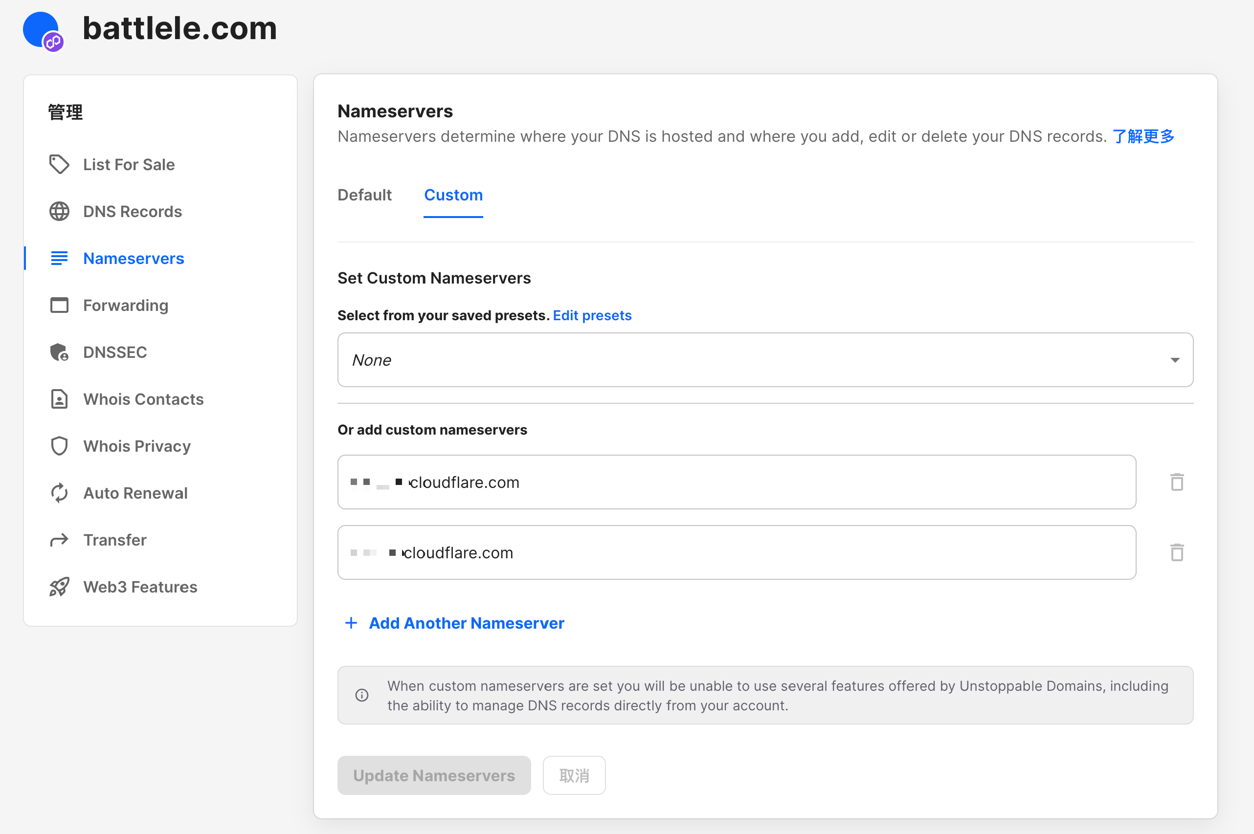 在设置的 Nameservers 里填入 Cloudflare 的服务器(DNS 记录里)。然后就大功告成了,实现之前一样的目的: